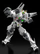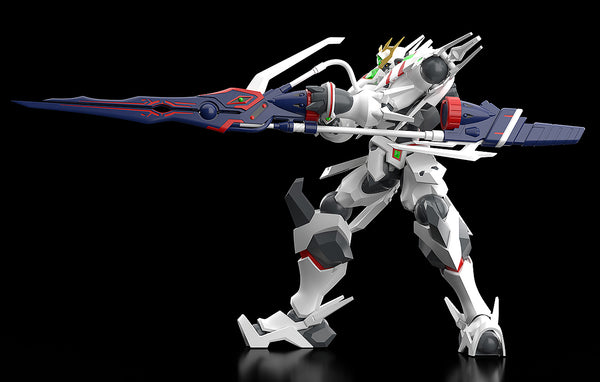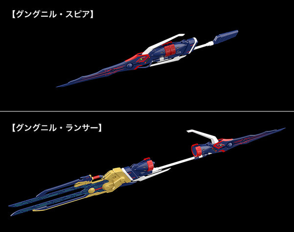 · The model stands at approx. 180mm in height and its joints are fully articulated. · Weapons such as the Gungnir Spear and Lancer Unit are included.  The Gungnir Spear and Lancer Unit can be combined to form the ultimate weapon, the Gungnir Lancer. · The Gungnir Spear can be used to recreate both states of the particle cannon with the use of interchangeable parts. · The arm cable connection and internal arm grip states while equipped with the spear and lancer can be recreated with the use of interchangeable parts. · Face parts are interchangeable. The one-eyed face, double-eyed face and one-eyed masked face states can be recreated using different combinations of the face parts. · Assemblable Rimhugens Dragon Fang and Same same in the same scale are included. · The various parts of the mecha have been separated into different colored runners and pre-painted parts, and the model kit also comes with stickers, making it easy to recreate the mecha from the series with a simple assembly.