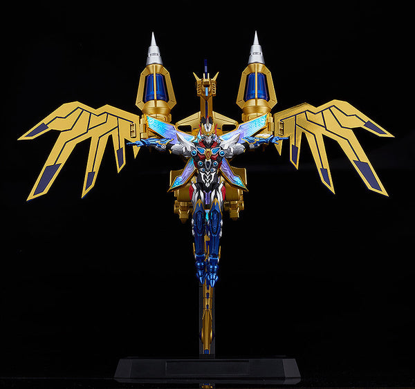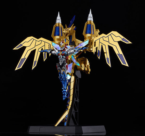 When combined, its chest (the back of Big Goldburn when not combined) ornamentation features a double-plated look with gold plating and prism plating. Equipped with a light-emitting feature. (Requires LR44 batteries x3 sold separately). The wings of Big Goldburn are stamped with gold foil. The blue areas of Big Goldburn are made with translucent parts. Figure can also be displayed firing the Grid Hyper Fixer Beam. Dedicated Display Stand Comes with a dedicated sleeve that can be used in combination with the package of THE GATTAI Gattai Ryujin DX Dynazenon (sold separately). ▼THE GATTAI Cho Ryuoh Gattai Chojin DX Rogue Kaiser Gridman Feature Site https://www.mechasmile.com/rogue_kaiser_gridman/en/