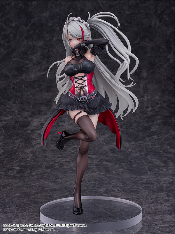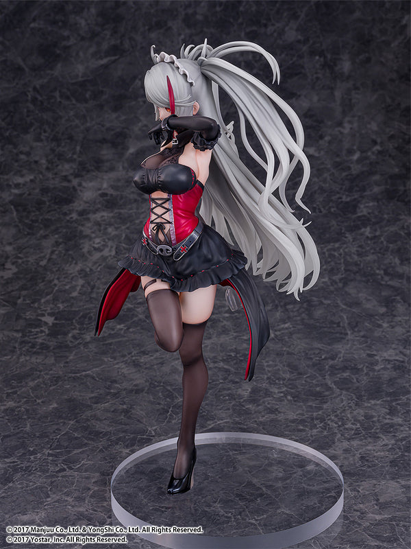 The figure is modeled after the live 2D costume “Kindred Evening Spirits,” capturing her at a bar counter in an elegant dress. Her black and red outfit is carefully painted with varying textures to create the look and feel of luxurious fabric. She draws you with an arch smile and the tip of her tongue just visible. We expand the interpretation by suggesting that she is secretly hiding a wine glass behind her back to extend this enchanting night with the Commander just a little longer. We hope you'll enjoy the mature side of the cool and mysterious Prinz Eugen, in your own hands.