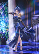The figure's outfit is based on Kanade's beautiful gown from "Pretty Liar" by Mysterious Eyes, a unit comprising Kanade and Kaede Takagaki. The form-fitting gown features a daring off-the-shoulder neckline. The long, flared skirt with a slit provides a bold glimpse of Kanade's legs, which adds to the splendor of the figure's pose. Translucent parts have been generously scattered across the dress to replicate the stones and feathers of her outfit, which is colored blue, Kanade's image color. Be sure to admire the figure's many visual highlights, including Kanade's lace-gloved hands and her coy pose.