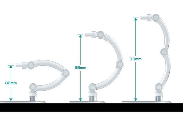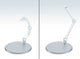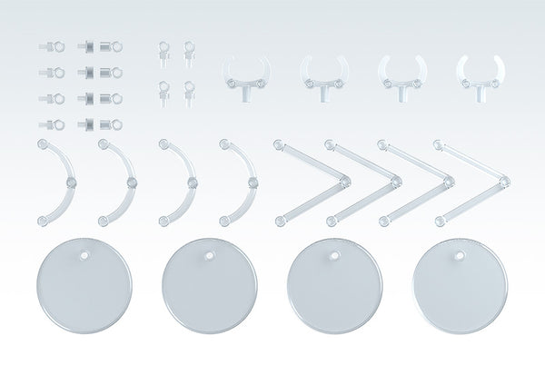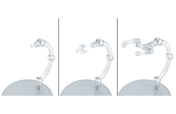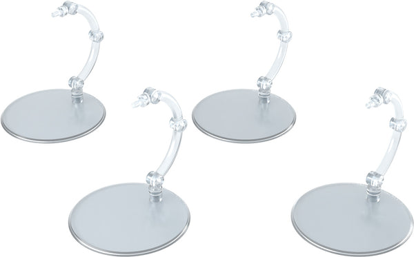 Presenting a set of 4 simple and affordable display stands! These stands, perfect for small figures around 10cm in height, feature a plain, transparent design. The support arm is equipped with a 3mm pin for connecting to holes of corresponding size. Attachable clamp-style parts and hexagonal pin parts for Nendoroid figures* are also included. The stands are made with transparent ABS resin. The diameter of each base is around 6cm. Two types of support armsa curved type and straight typeare included. The curved support arm can be adjusted from 3 to 7cm in height, while the straight support arm can be adjusted from 4.5 to 10.7cm in height.