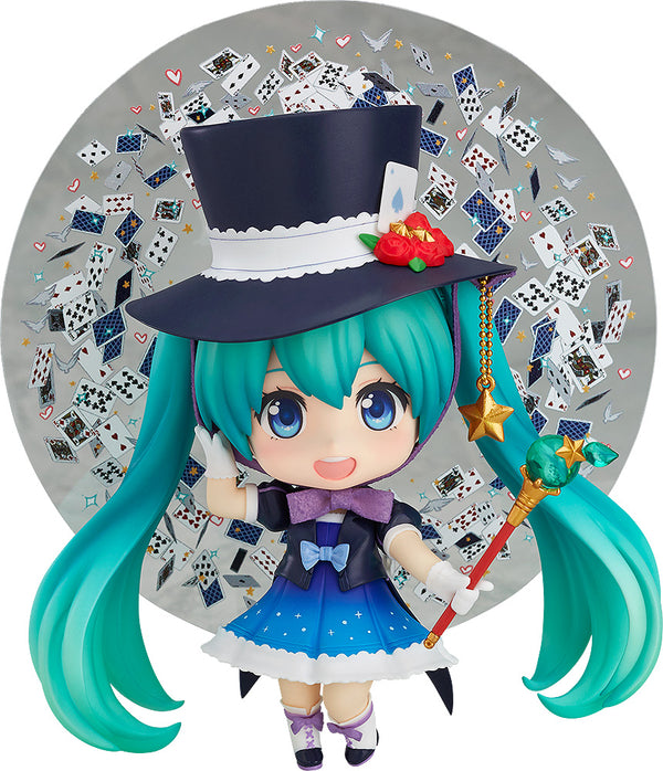 From "Character Vocal Series 01: Hatsune Miku" comes a Nendoroid of Hatsune Miku wearing her outfit from the Magical Mirai 2013 main visual illustration! She comes with three face plates including a standard smiling face, a more serious smile with her eyes looking to the side as well as a cute smiling expression with a slight blush and closed eyes. Optional accessories include her trademark hat as well as her magic wand sculpted in beautiful detail. She also comes with colorful magic effect parts to display her performing magic, as well as parts that allow for a cute sitting pose! A special background plate drawn by the illustrator CHRIS is also included to really bring out the magic!