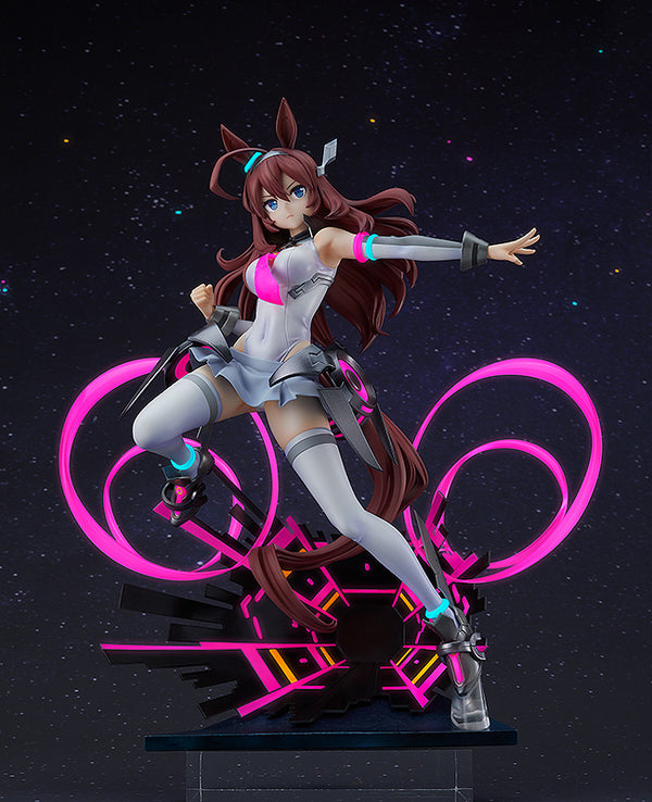 Highly precise gradated paintwork is used in order to faithfully capture the unique textures of her sci-fi-like Signature Racewear. The sleek physique of the "cyborg" Umamusume is modeled with incredible attention to detail, making the figure a joy to view from any angle.