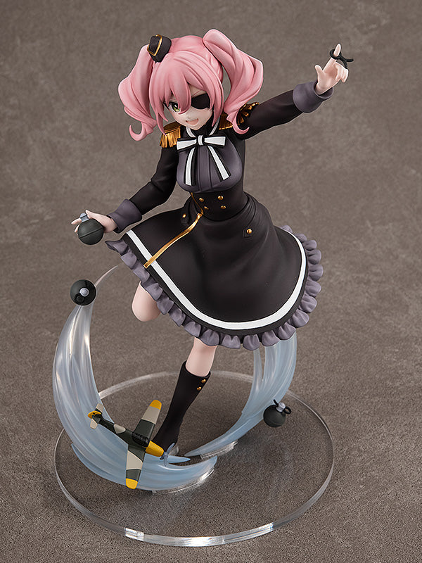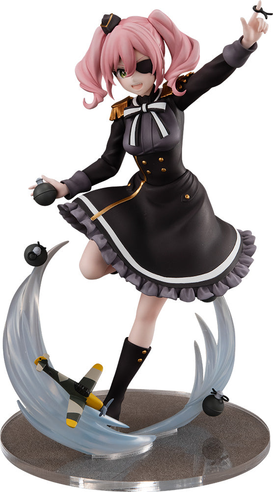 A radio-controlled airplane used for surprise attacks and additional grenades are also shooting from her skirt! Her smile contrasts the dangerous situation she is placed in, reproducing Annett's extravagant personality.