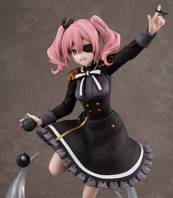 Her fluffy pink-gray pigtails, her protruding fang that can be seen in her smile and her sparkling eyes are as adorable as an angel. However, she also has a homemade grenade in her hand, and its safety pin has already been pulled, meaning that it's about to explode!